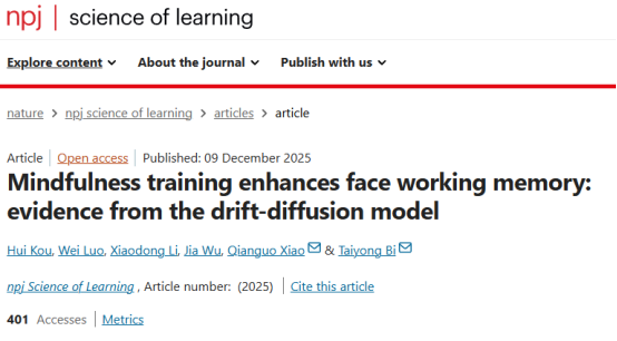 近日,tyc33455cc太阳集团(人文医学研究中心)应用心理学研究团队在学习和记忆研究领域的国际权威期刊《npj Science of Learning》 上在线发表了题为《Mindfulness training enhances face working memory: evidence from the drift-diffusion model》 的重要研究成果。该论文第一作者为寇慧博士,共同通讯作者为肖前国副教授和毕泰勇教授。