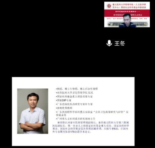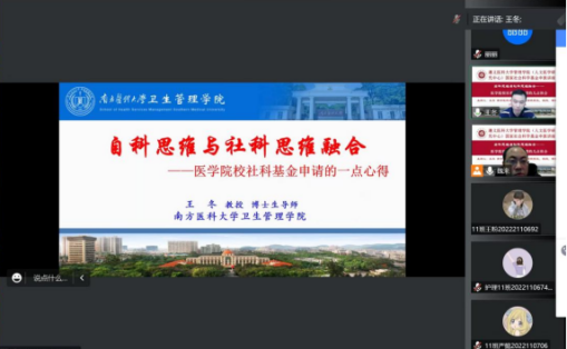 为切实推进2023年度国家社科基金项目申报工作,公司tyc33455cc太阳集团特邀请南方医科大学卫生tyc33455cc太阳集团经理、博士生导师王冬教授,于1月4日上午9:30—11:30,为公司全体教师做了题为《自科思维与社科思维融合-医公司校国社科申报的几点体会》的讲座。讲座以线上远程形式进行,tyc33455cc太阳集团副经理魏来教授主持讲座,公司人文社科教师、2023年度国社科拟申报老师及tyc33455cc太阳集团全体教师在线参与讲座。
