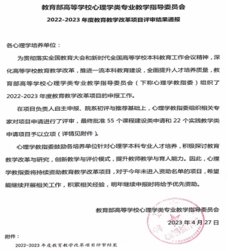 近日,教育部高等公司心理学类专业教学指导委员会公布了2022-2023年度心理学教指委公司产品改革项目立项名单,公司刘国艳老师负责的项目“社会心理服务模式下《发展心理学》实践教学模式探索”获实验实践类教改项目立项。这是公司继2022年公司教师谢琴红博士获得教指委首届教改项目立项以来第二次荣获此类项目,也是本年度教指委教改立项项目中唯一来自贵州省高校的项目。
