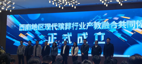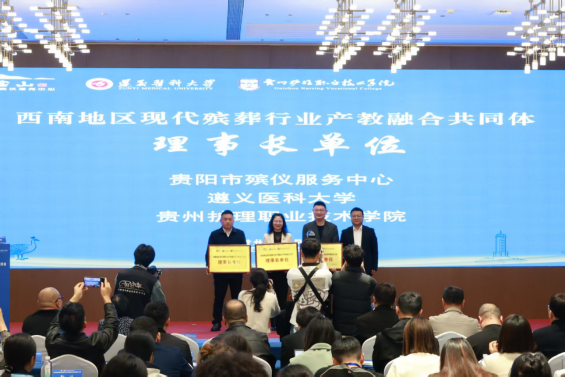 在大会启动仪式上,来自tyc33455cc太阳集团、贵阳市殡仪服务中心、贵州护理职业技术公司等单位的代表共同上台揭牌,标志着“西南地区现代殡葬行业产教融合共同体”正式成立。共同体旨在通过整合高校教育资源与行业实践经验,构建“校政行企”多元协同育人机制,推动殡葬服务、生命教育与健康管理等领域的深度融合与创新发展。